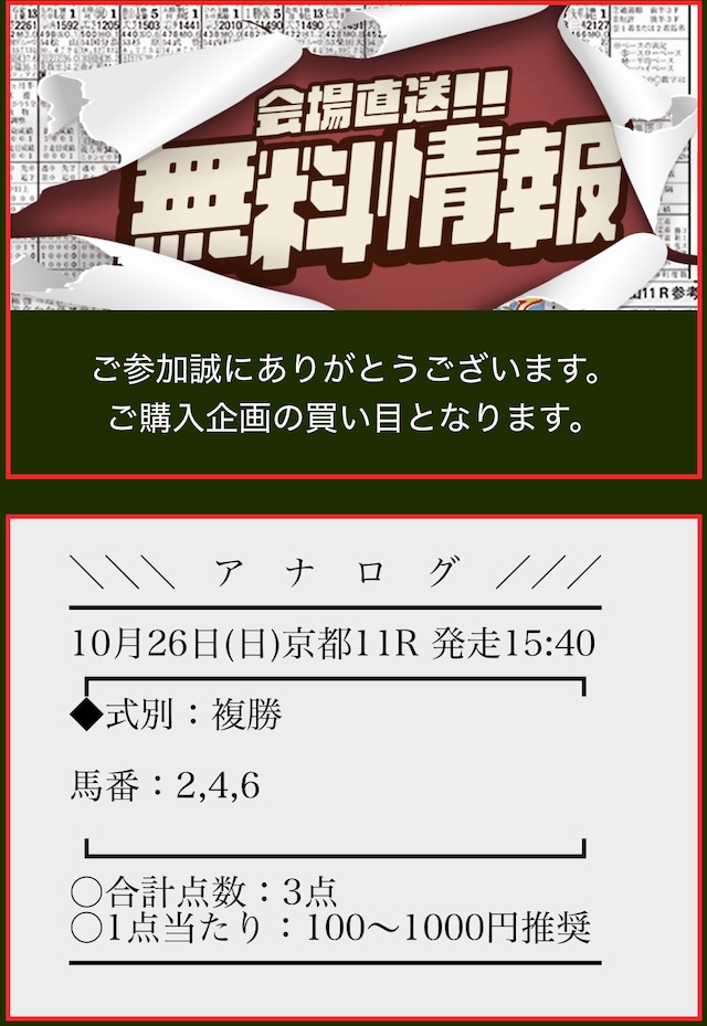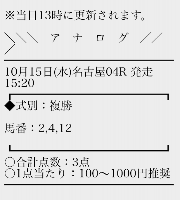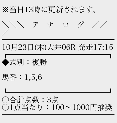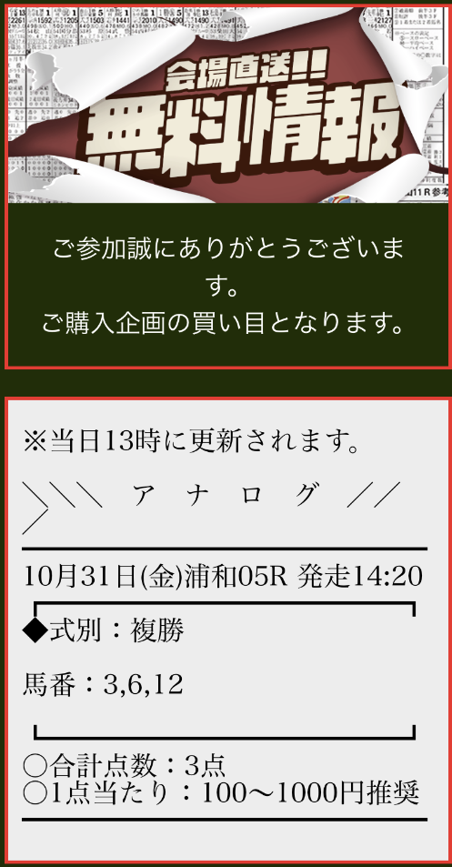 アナログの無料予想はワイド3頭ボックスを公開しており、馬券代は最低300円から勝負可能です。
