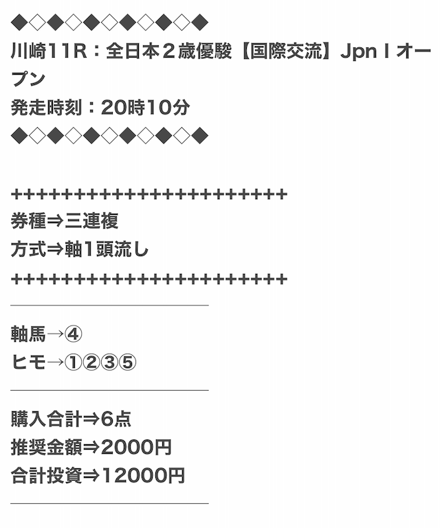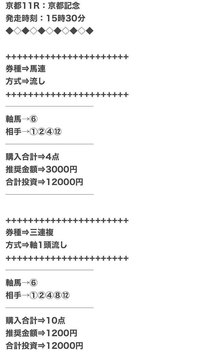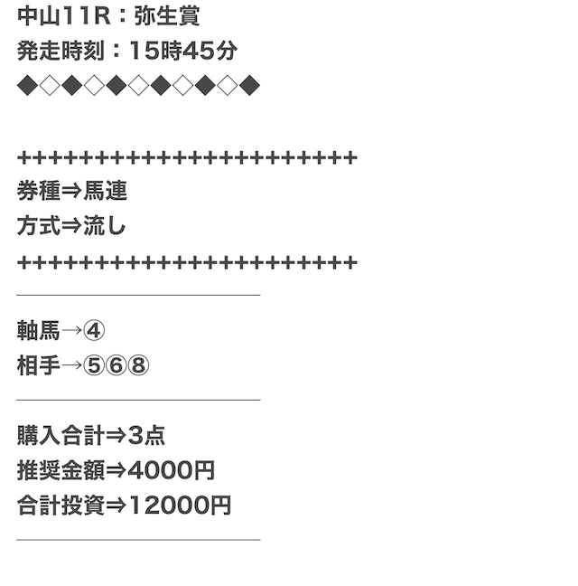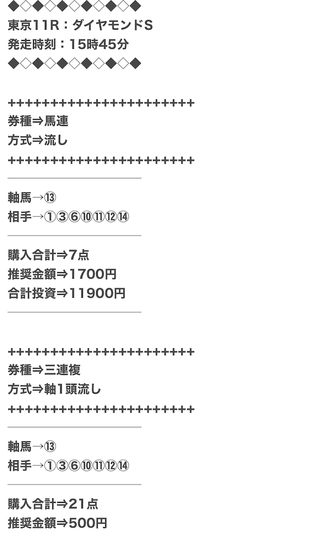 他のサイトと比べると買い目の点数が少なめ。低コストかつ高額払戻金を獲得できる◎
