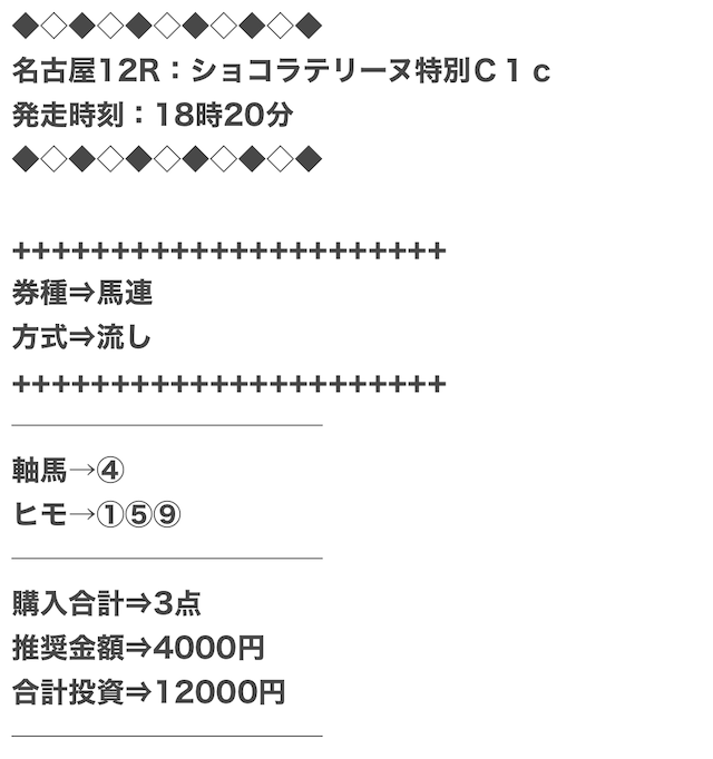 的中率は高く、複数の券種を公開していても的確に予想を当てている。しかし、少点数予想なので長期で使った際の的中率は心配△