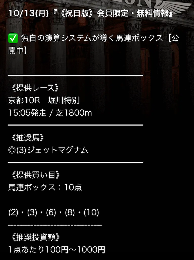 実際に公開された買い目はこちらです。