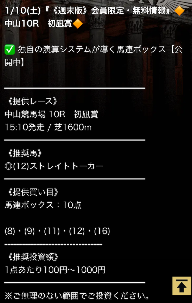 少しでも的中確率を上げるためにレースを選んでいる。継続して使っても的中率は高め◎ |