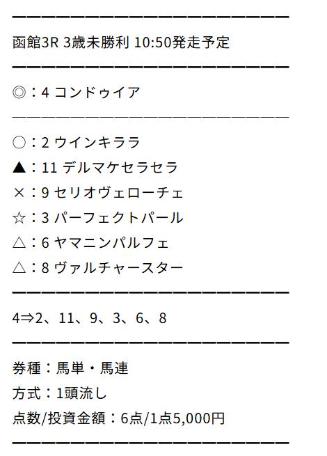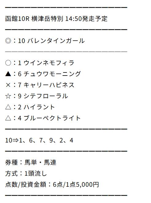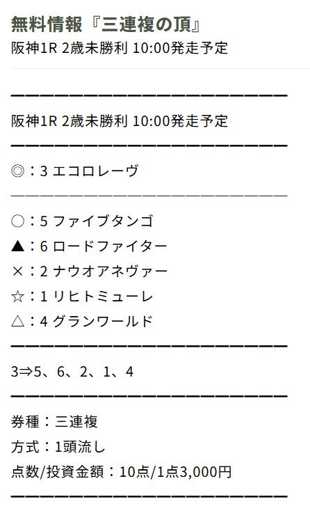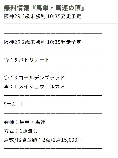 4レース提供レースのうち2レースが的中。阪神の5レースに7レース三連単。
