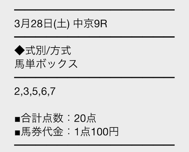 | 2026/3/28 | 中京9R | ○ | 85,100円 |