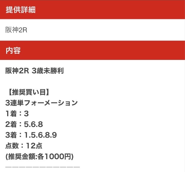 さっそく、公開された買い目(2025年6月15日の阪神3R)を見てみます。