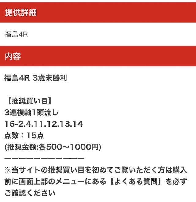 有料予想が安価な点、有益なコンテンツを無料で見れる点でコスパは最強。500円で参加できる初回限定プランや登録特典の1万円分のptは活用したい。 |
