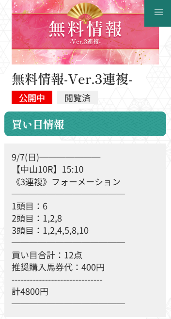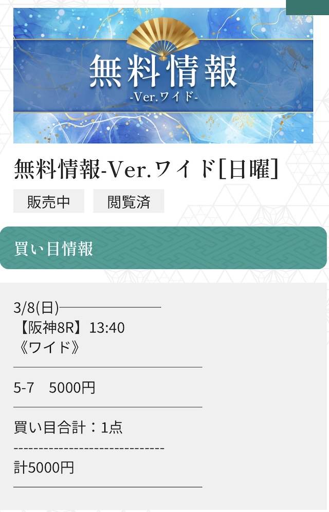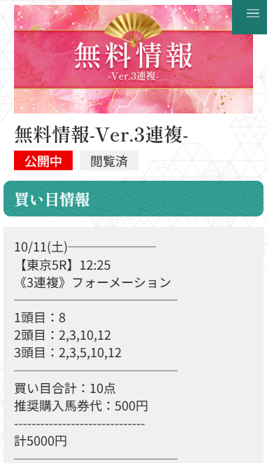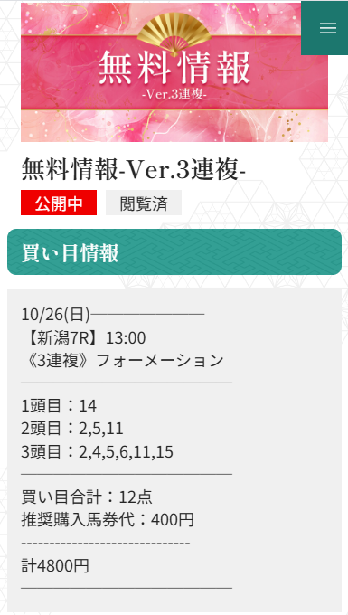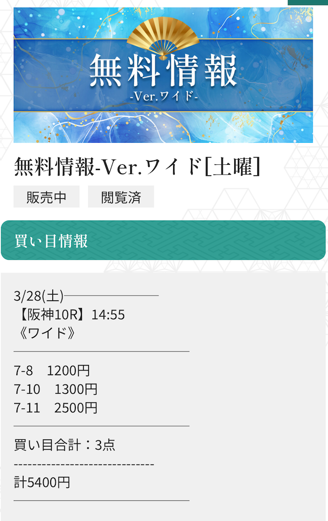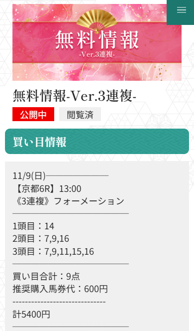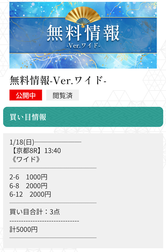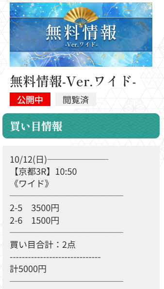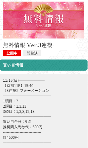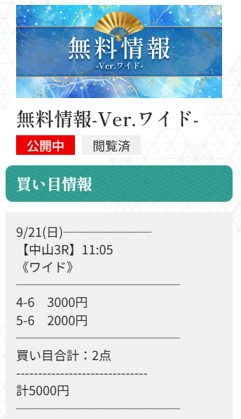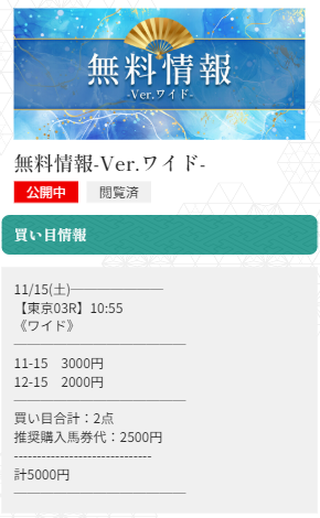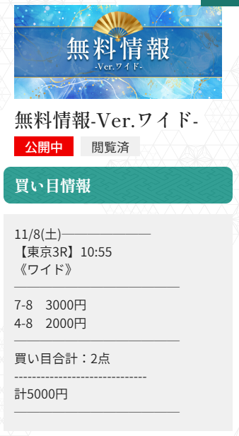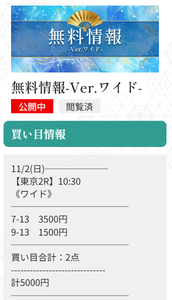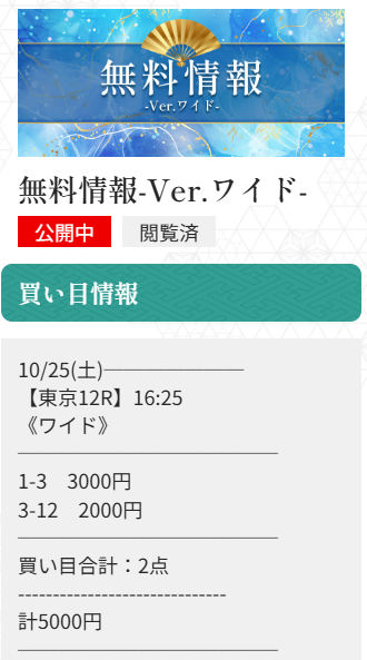 1日2レースの公開で、3連複verとワイドverの2種類の買い目が公開されます。