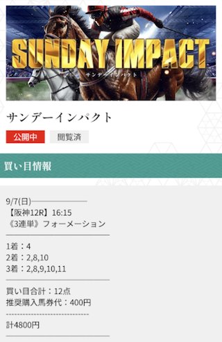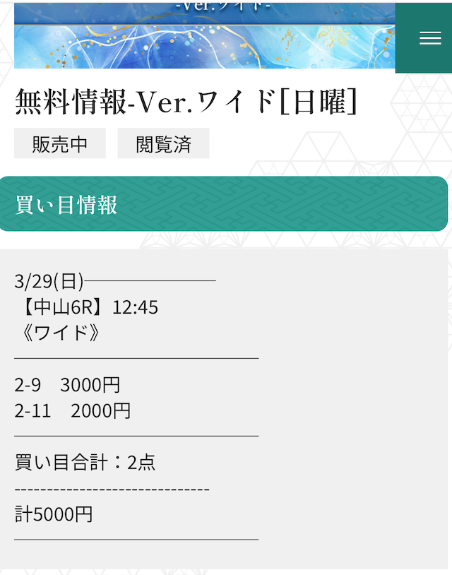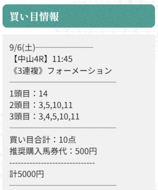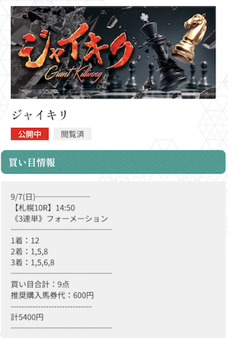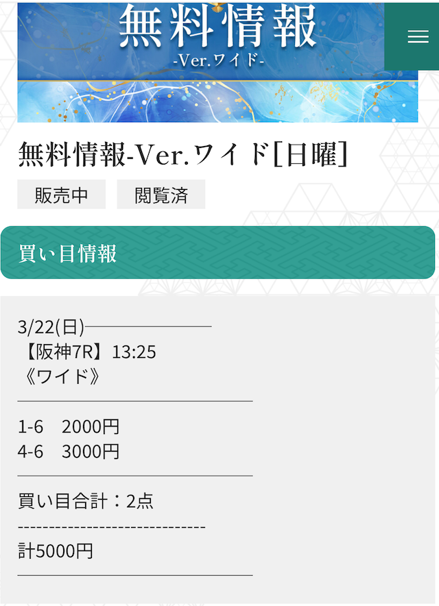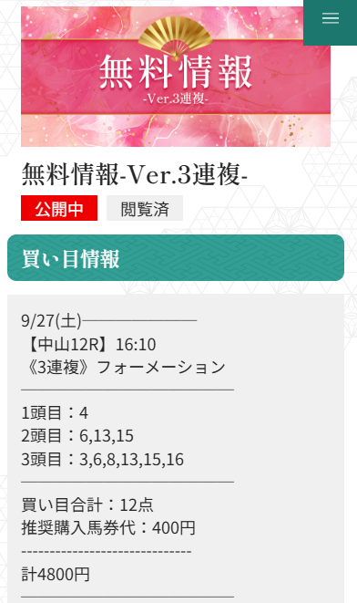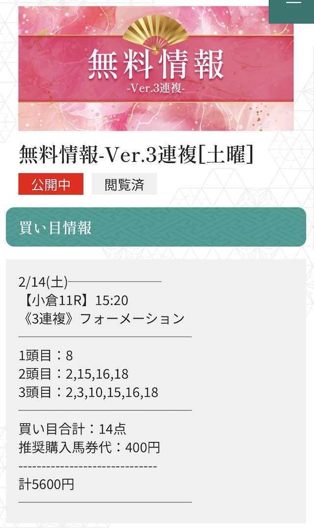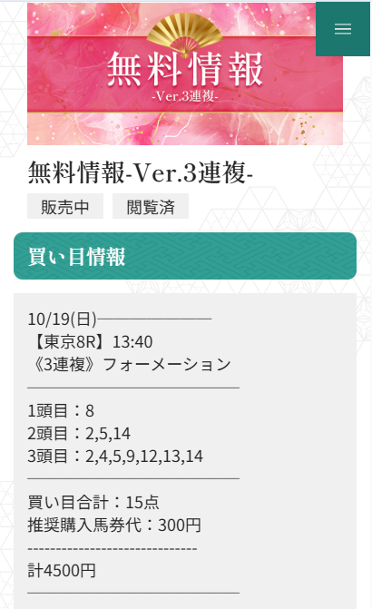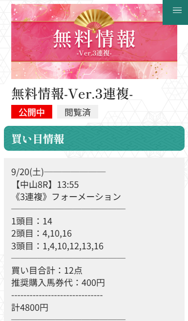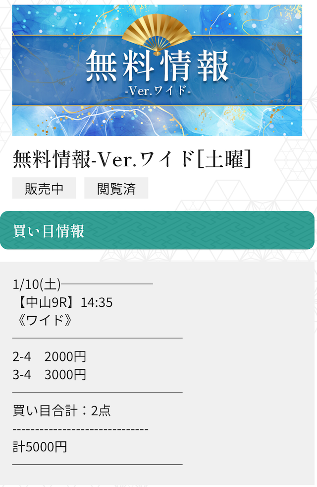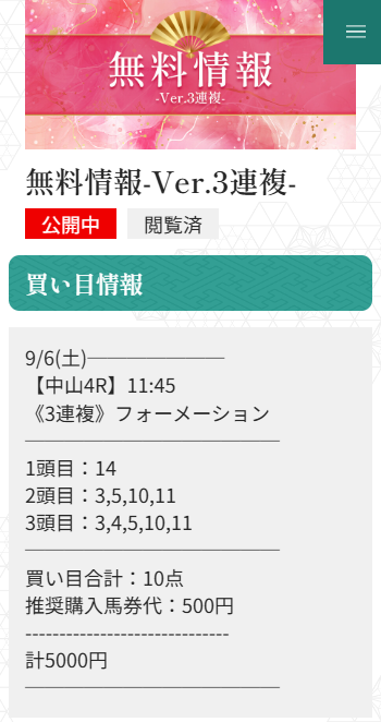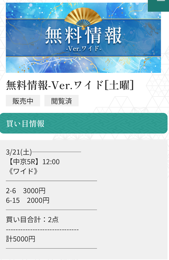1日2レースの公開で、3連複verとワイドverの2種類の買い目が公開されます。