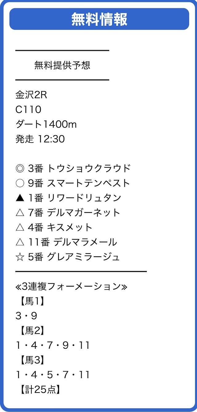 | お試しセレクト | 20,000円 | 3連複(7,500円) |