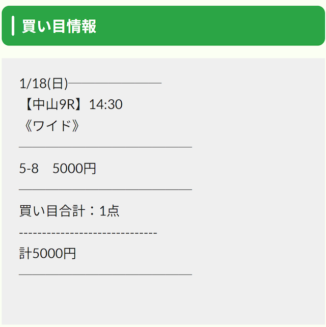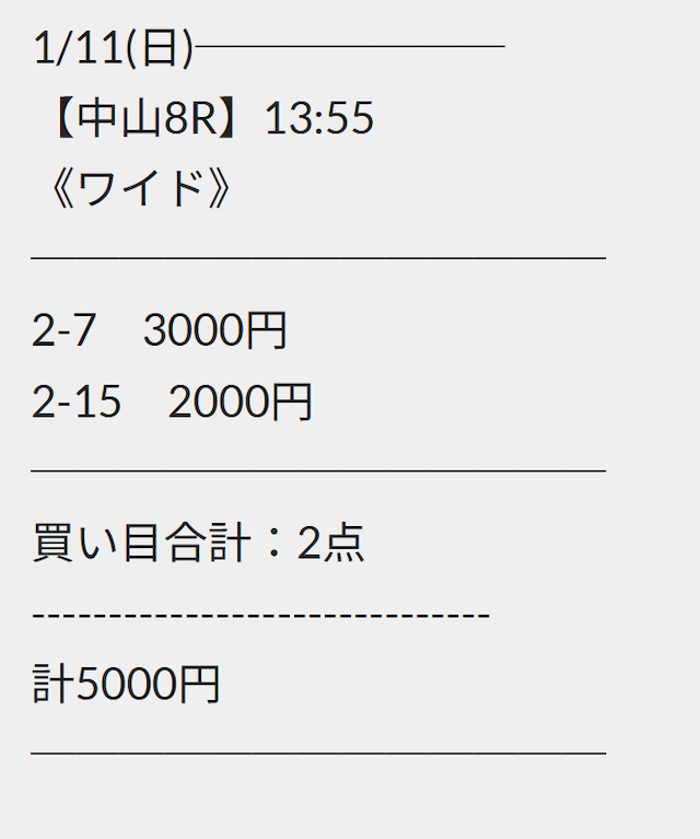 点数は抑えており、払戻金も高額というほど稼げない。馬券代の2〜3倍程度◯ |