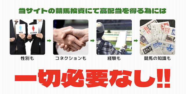 競馬の知識が全く無くても、予想に乗るだけで勝てるとのことです。