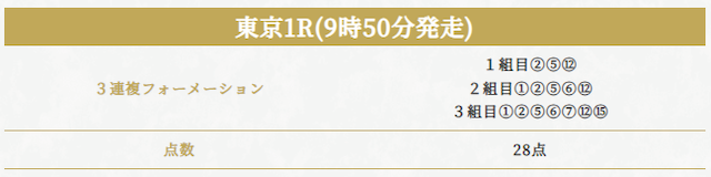 | 馬券代の安価さ | △ | 買い目点数は28点なので、 1点あたりの馬券代に要注意。 |