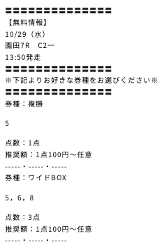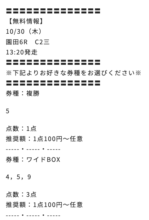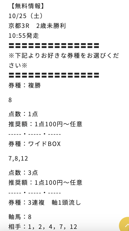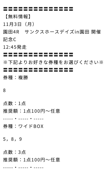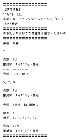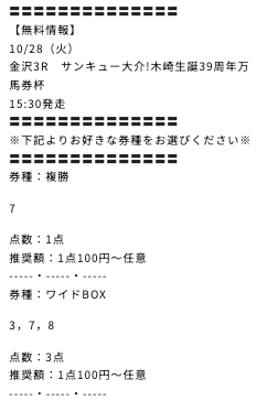 公開している券種は無料予想だと複勝とワイドと3連複なんですけど、どれでもあたりますよ。