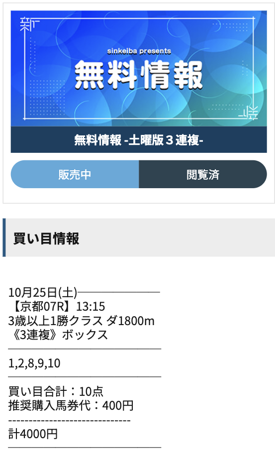 シンケイバの無料予想の内容のまとめはこちら。
