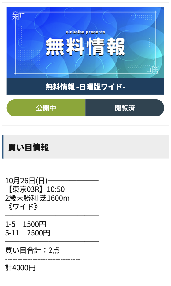 無料予想をワイドで提供しているサイトの場合、シンケイバのような2点で提供するケースはそこまでありません。