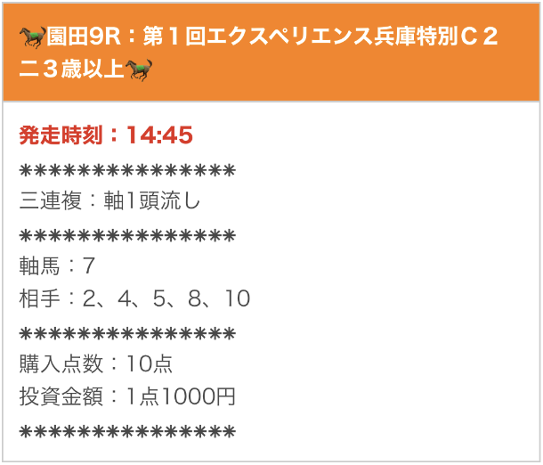 | 推奨馬券代 | 10,000円前後 |