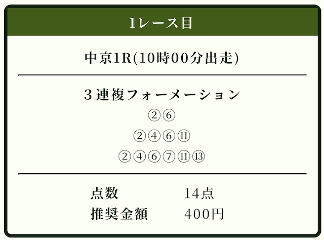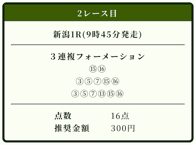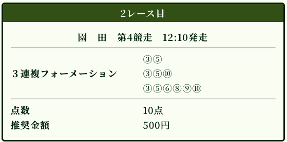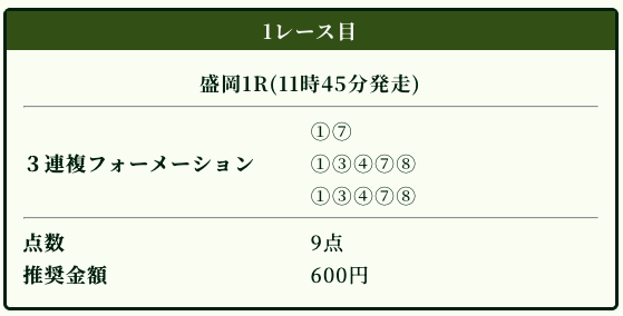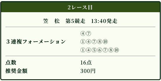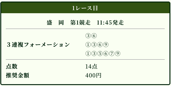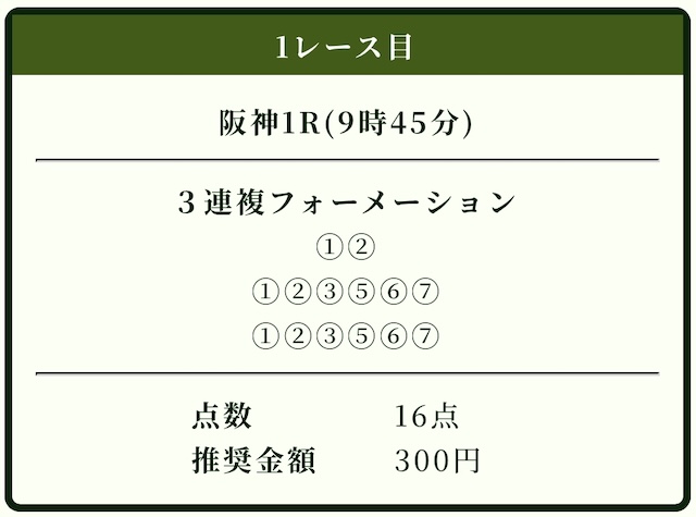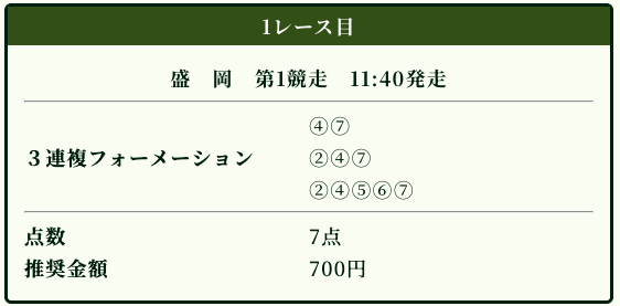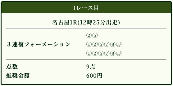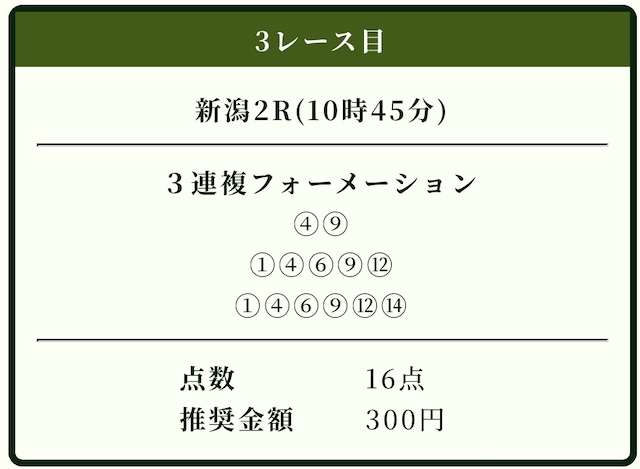 推奨馬券代 | 1点200円前後 1レース5,600円前後 |