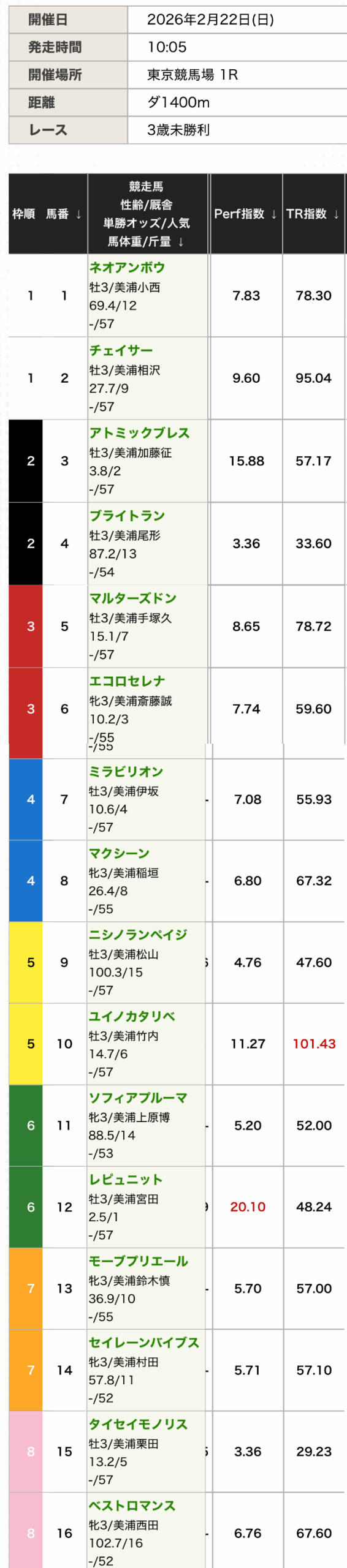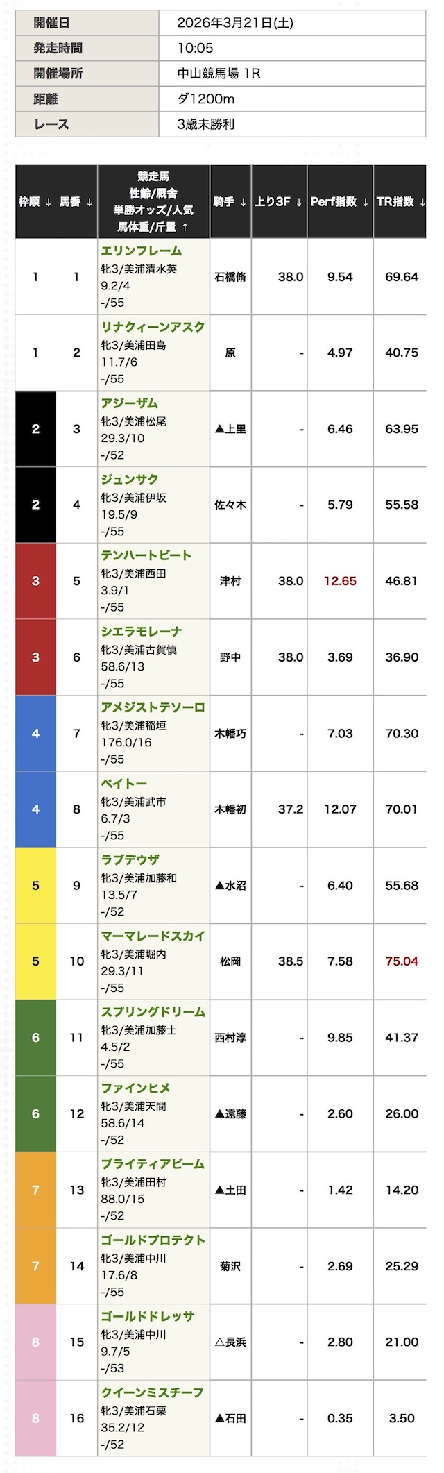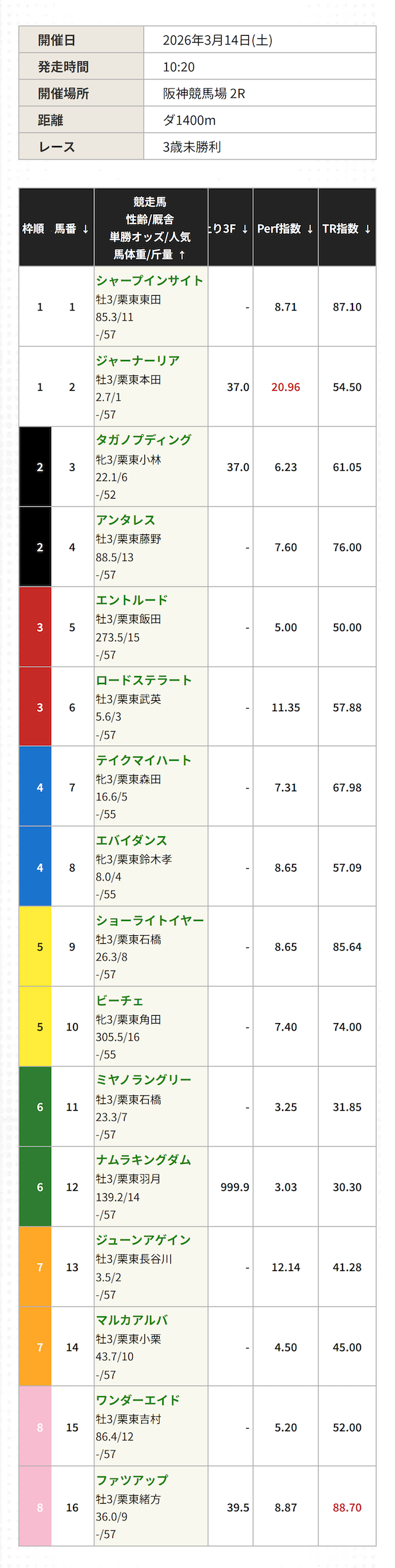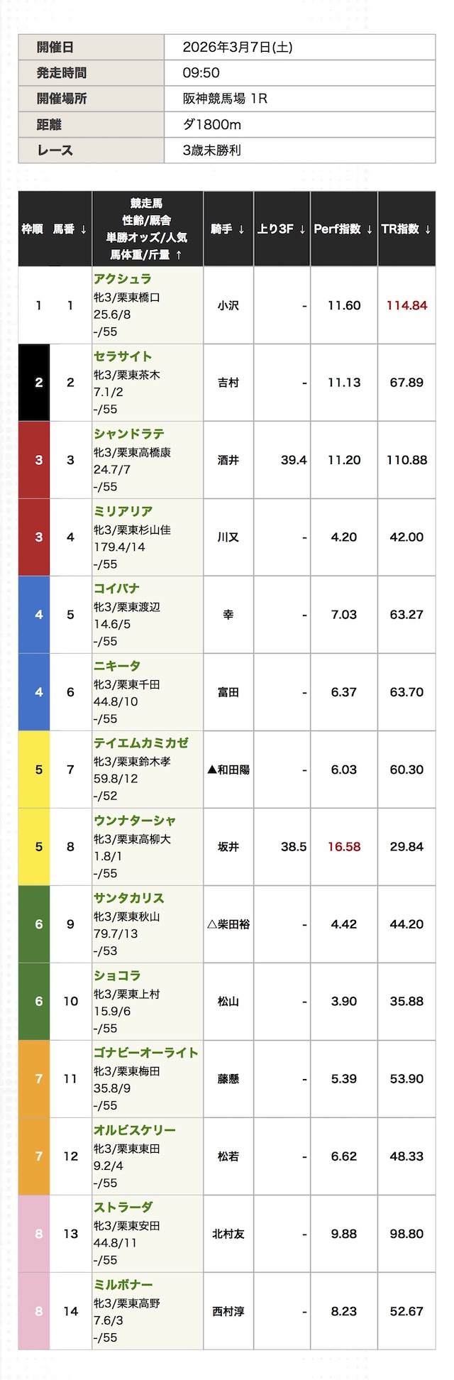 - 選出馬:Perf指数とTR指数のそれぞれ上位3頭(最大6頭)