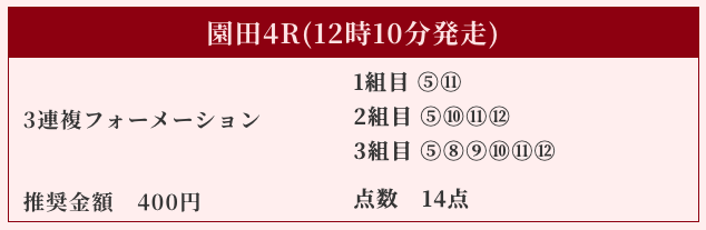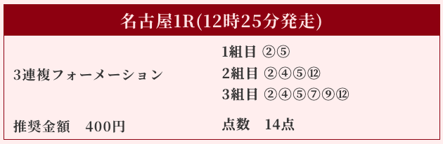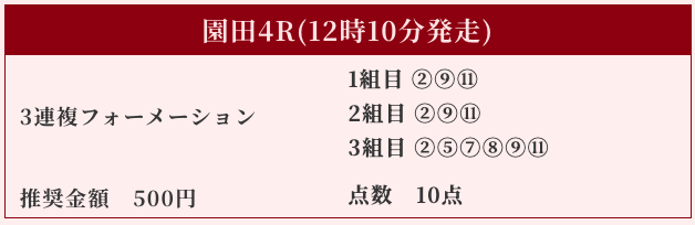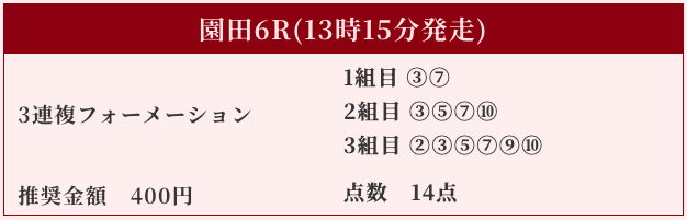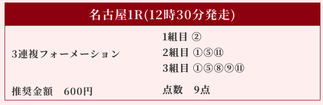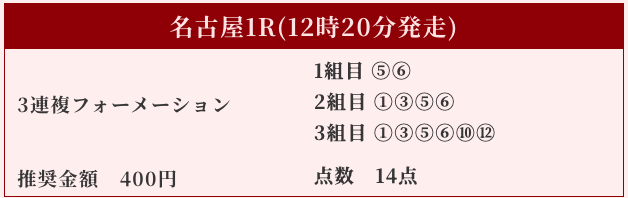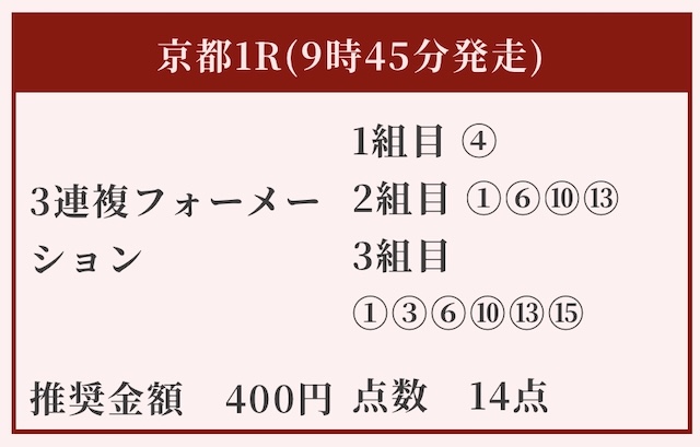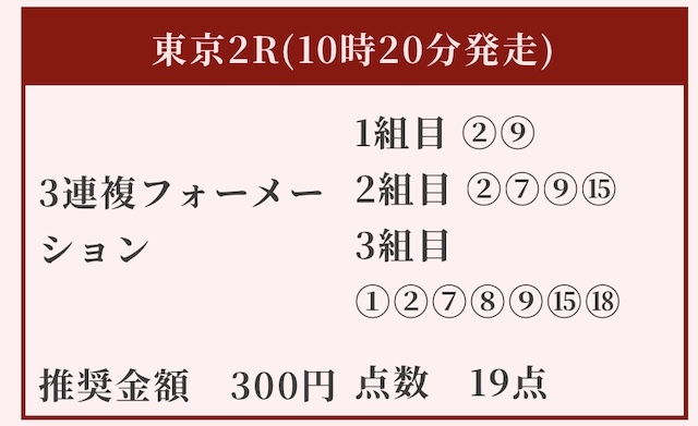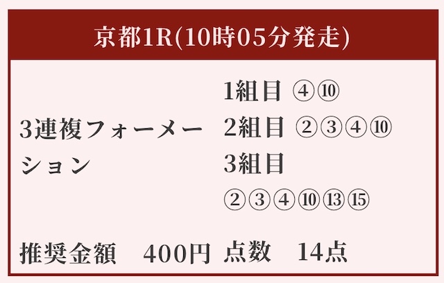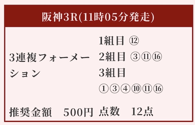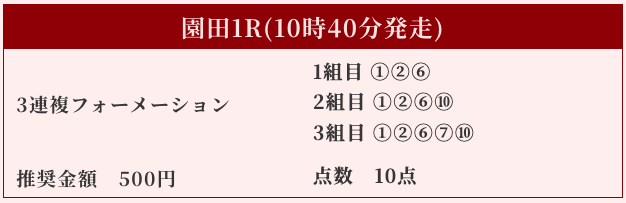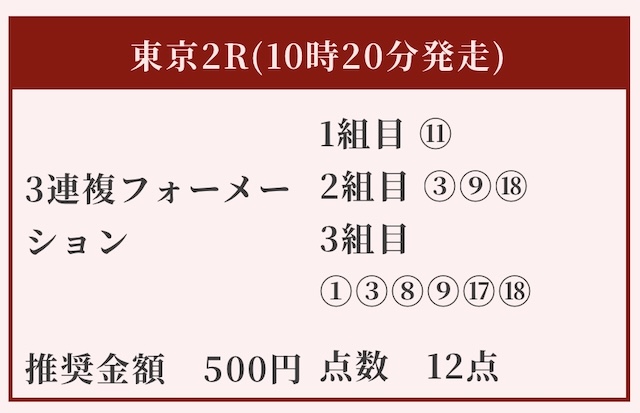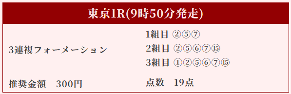 | 推奨馬券代 | 1R/5,000円〜6,000円 |