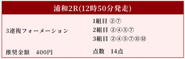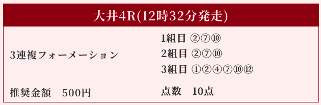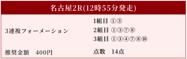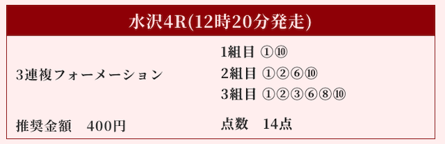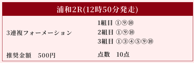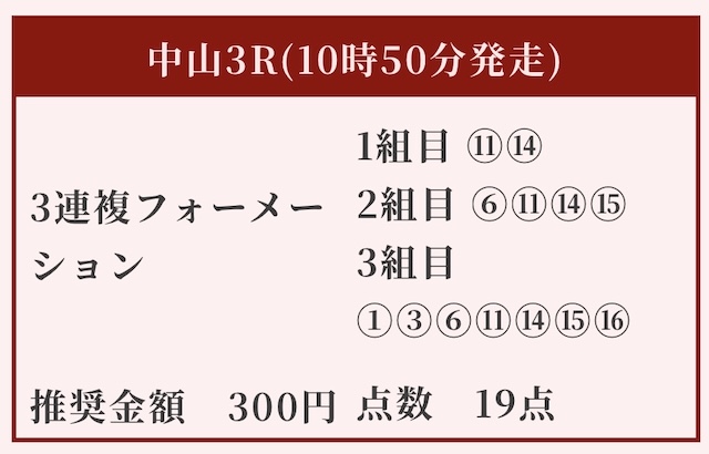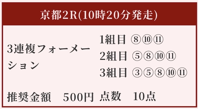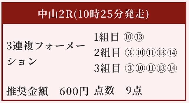 「2頭-3頭-6頭」の3連複フォーメーション、計10点勝負です。