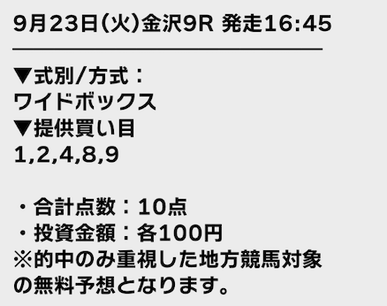 また、10点予想なので1点100円で勝負すれば1レース1,000円から予想に参加できます。