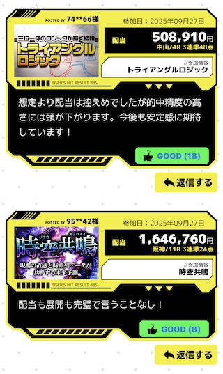 実績BBSとは、有料予想に参加した利用者が自由に投稿できるコンテンツ。