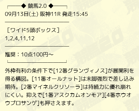 馬券師・AIの解析によって、特に精度に高い1レースを厳選しているとのこと。