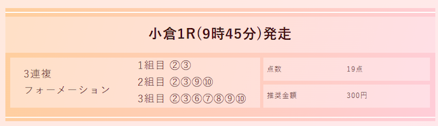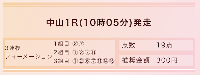 | 推奨馬券代 | 1点300円/19点 |