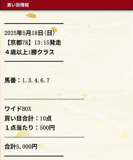 過去の戦績とオッズを見て6・7番人気ならギリギリ馬券に絡むかもと思いましたが、本当に当てた事に驚きました。