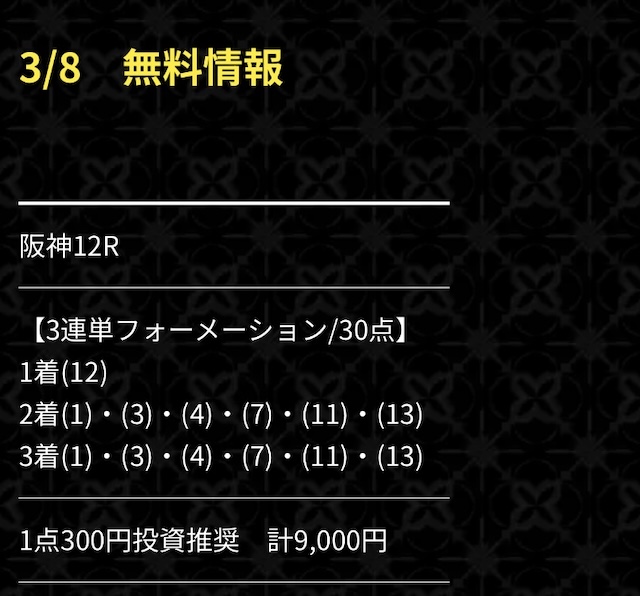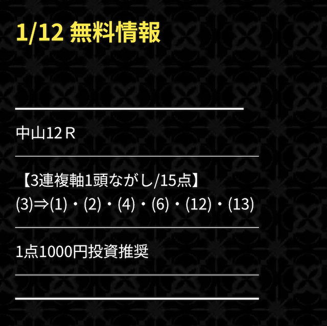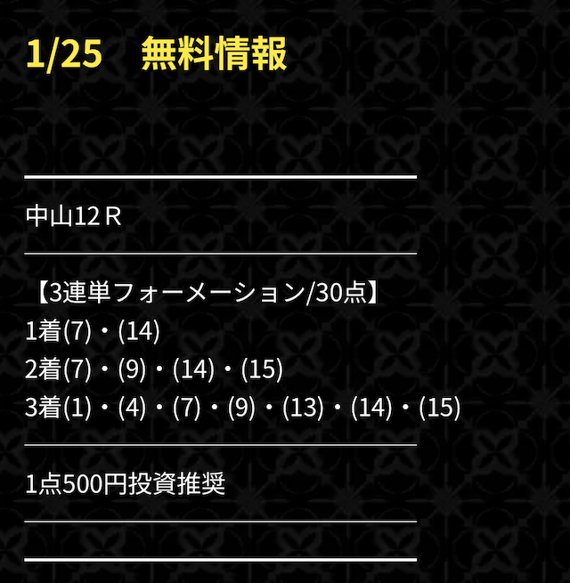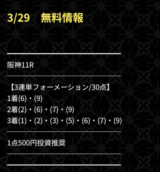 無料予想の初戦、実際に公開された買い目はこちらです。