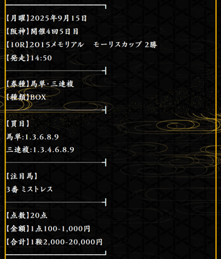 騏驎は質の高い情報を扱っており、買い目を構成する際の馬選びが抜群でした。