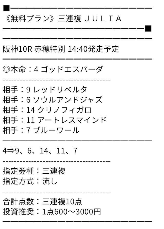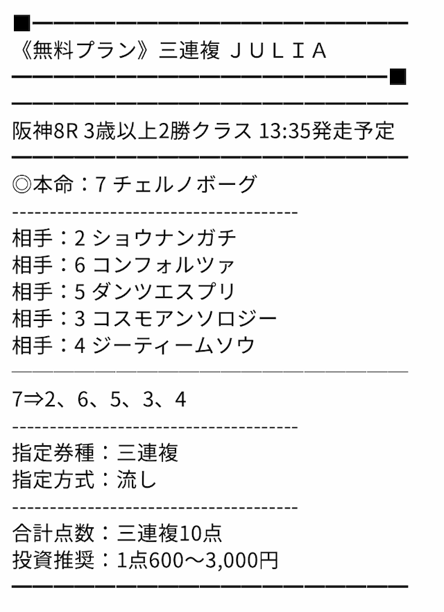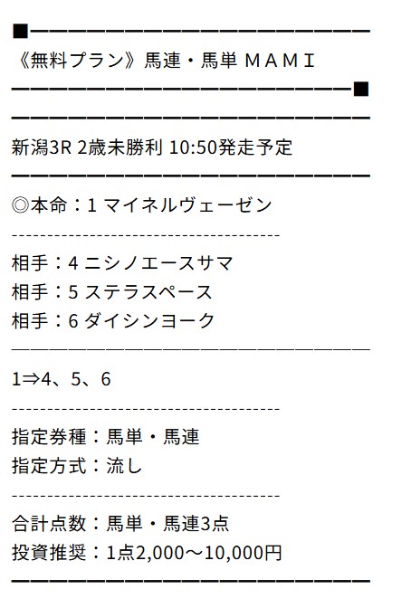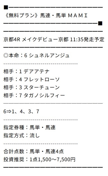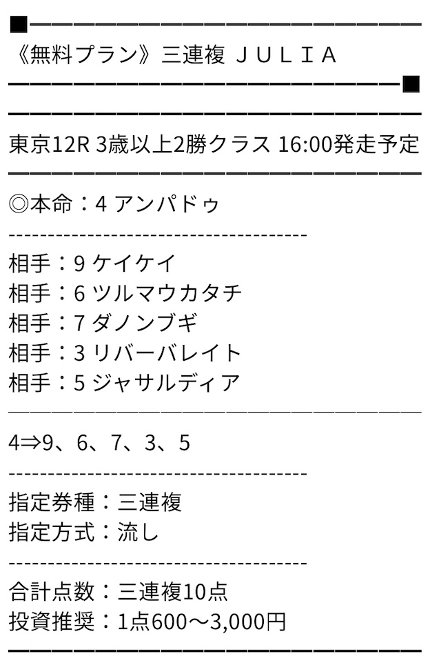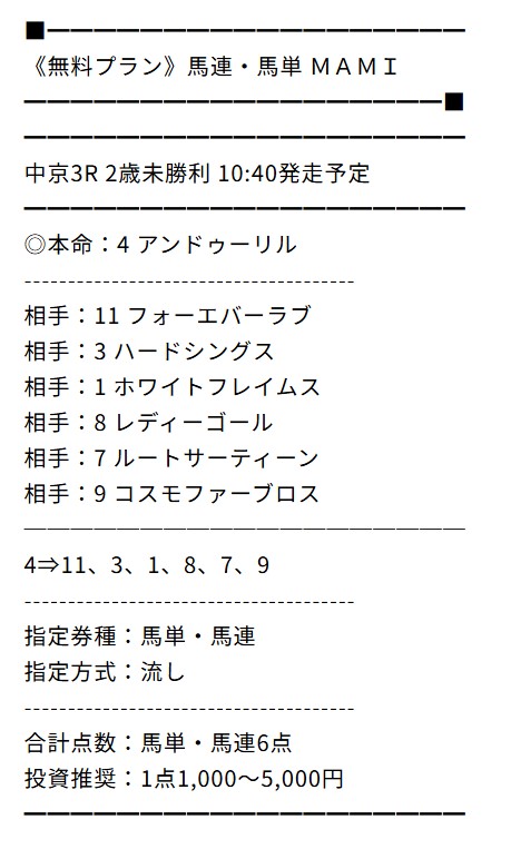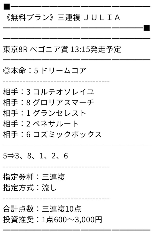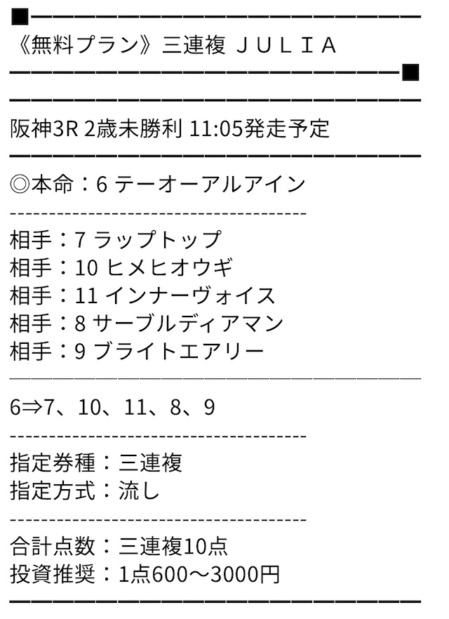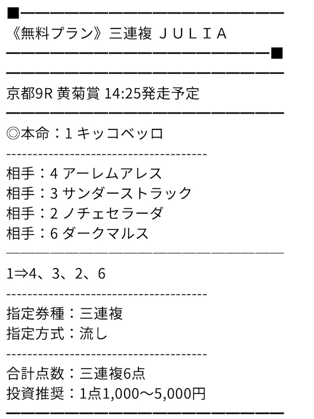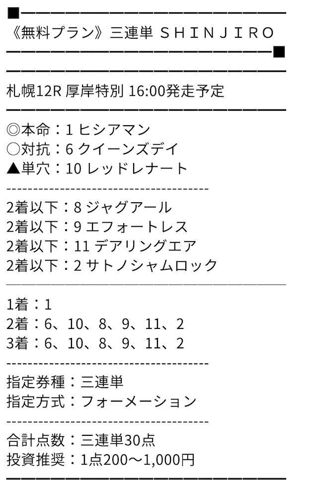 無料情報の的中率は最高、無料だけでもいいくらいと思っていましたが、ポイントプランで一撃帯が獲れて考えが変わりました。