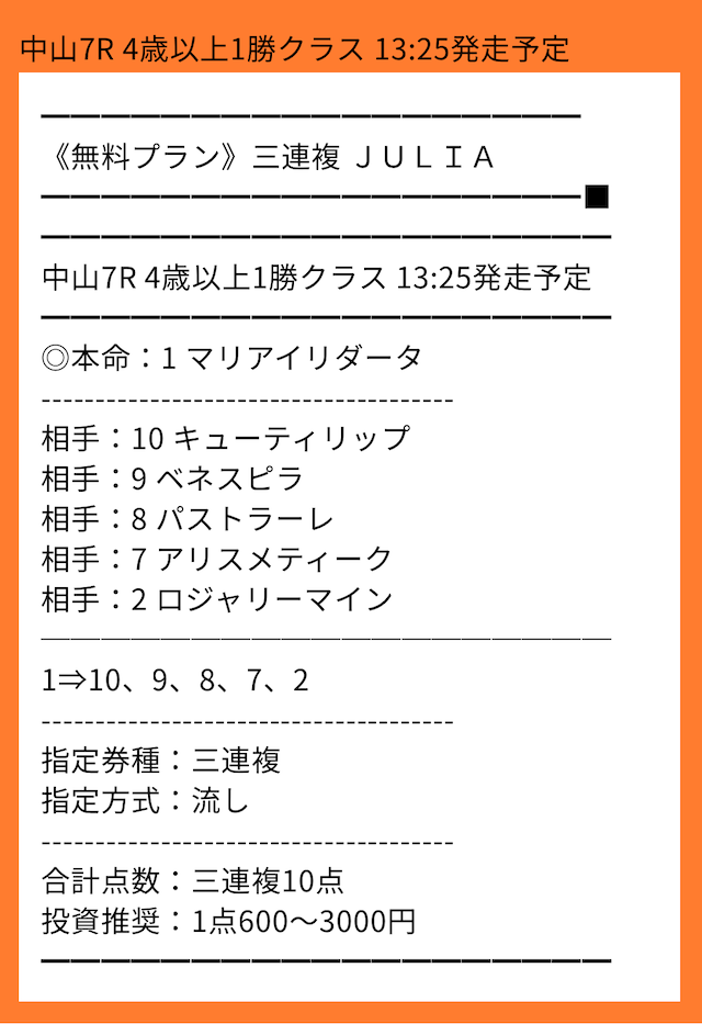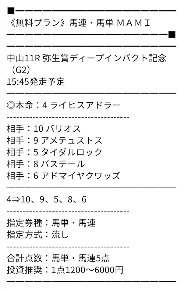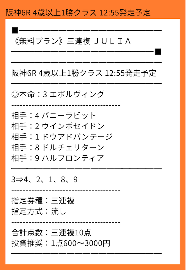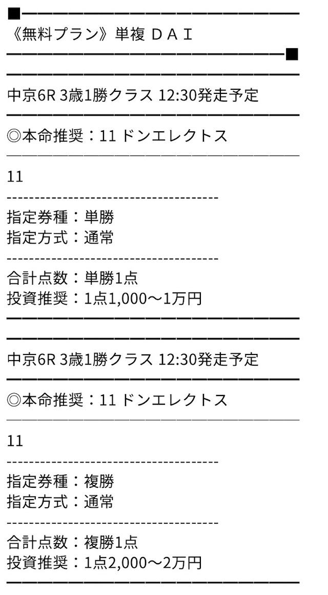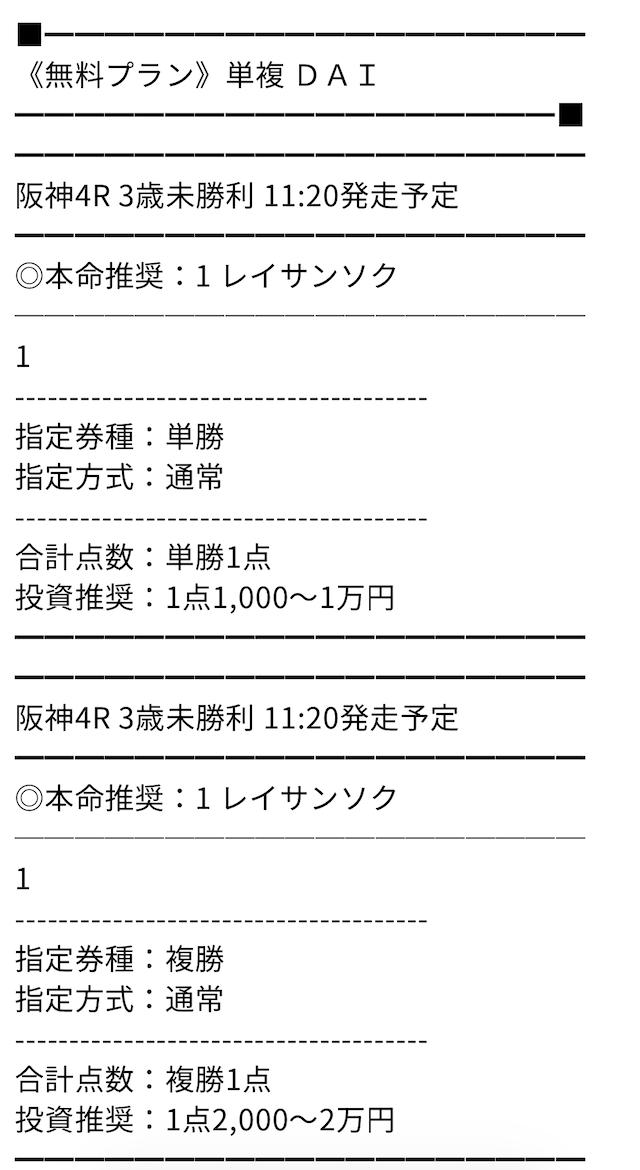 他のサイトから移ってきました。はっきり言ってここのレベルは高いです。的中精度や展開読みはプロの技。他のサイトが素人というのがはっきりわかりました。