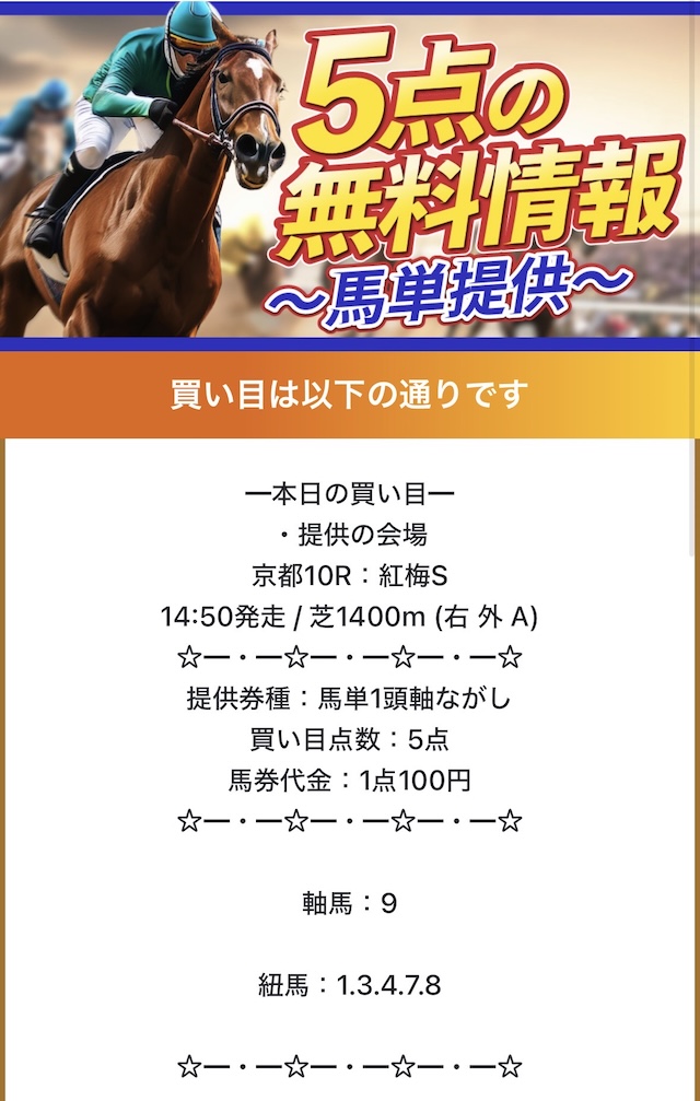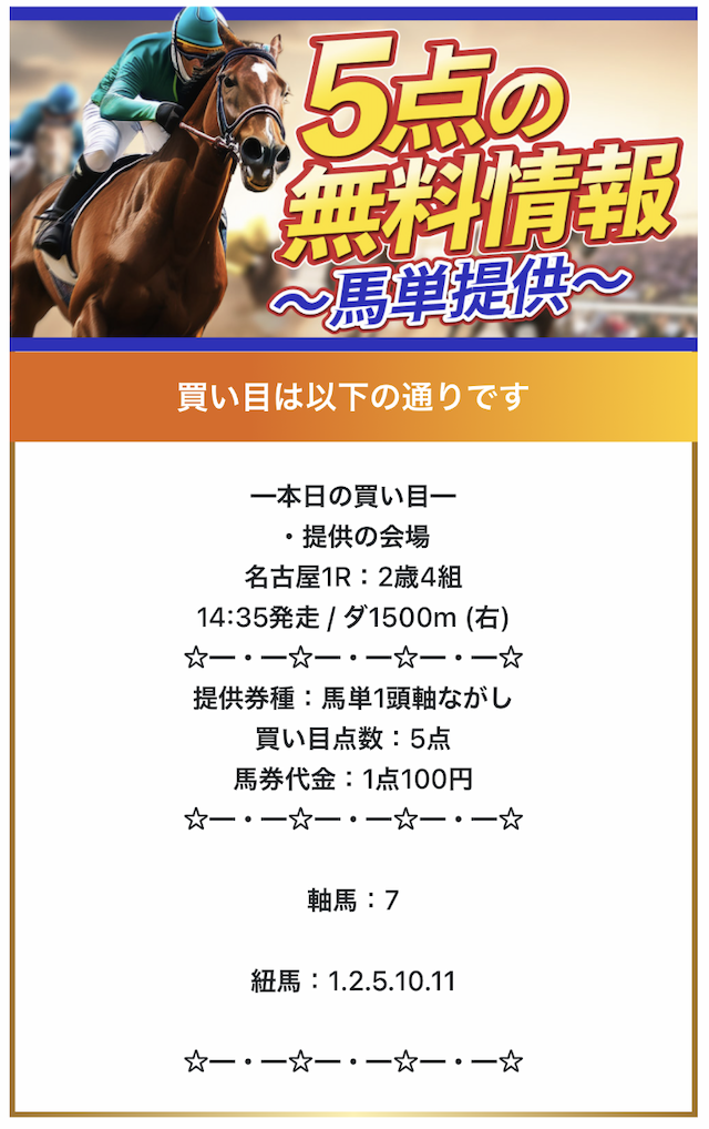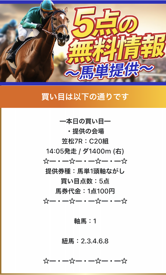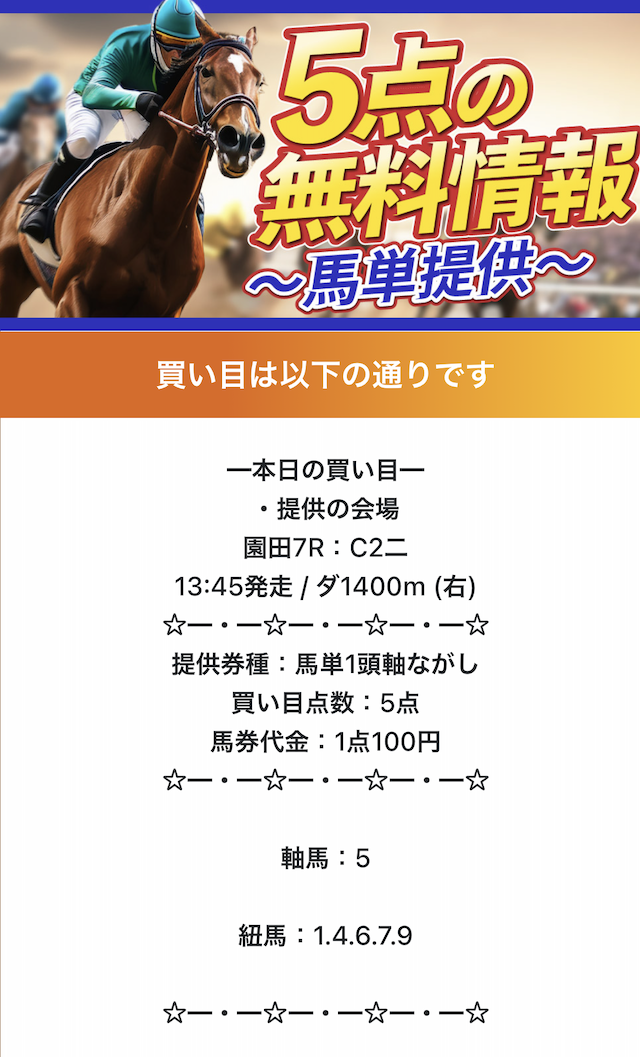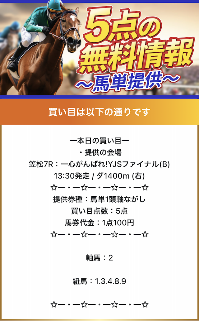 予想サイトにしては通知少ないし、ほぼノンストレス。毎日公開だから予想見たいときに見れるし、地方も勝てるから助かる