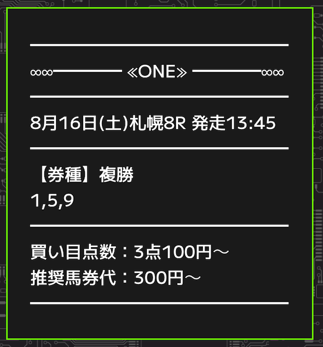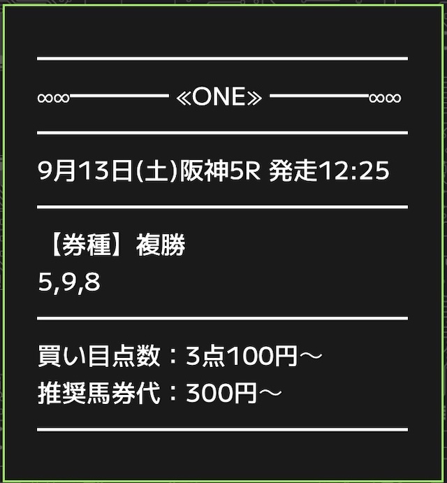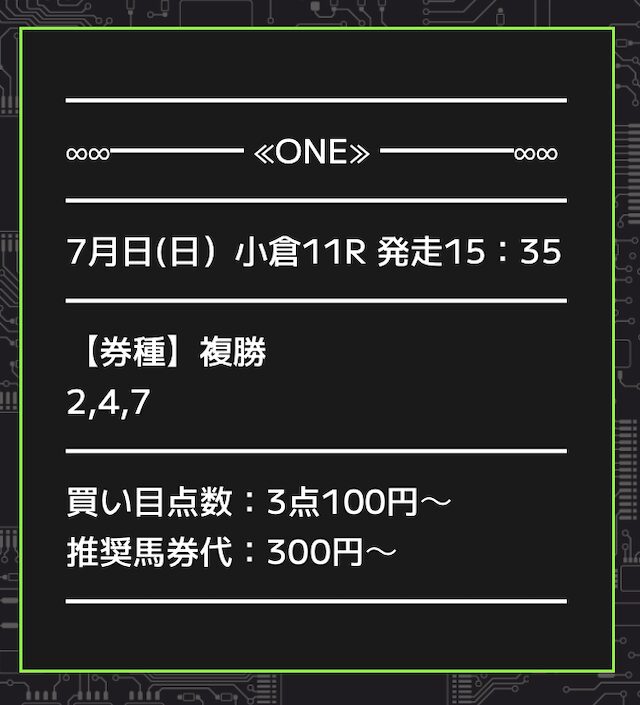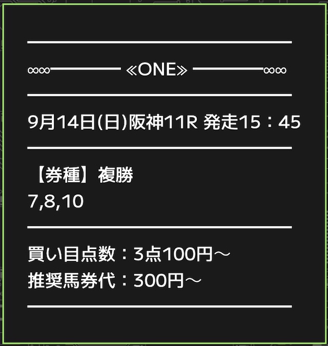 ONEの無料予想は高い的中率を維持しており、人気馬をメインにした堅実予想を公開していました。