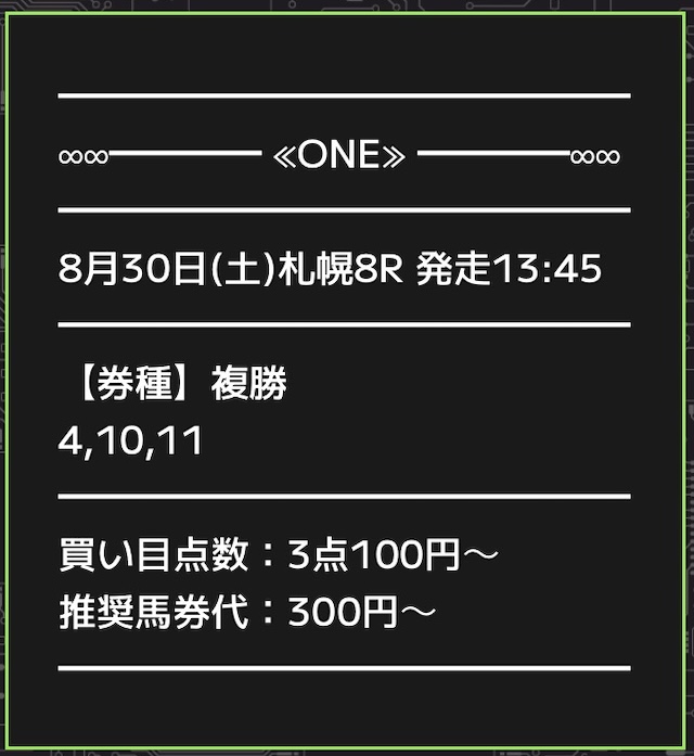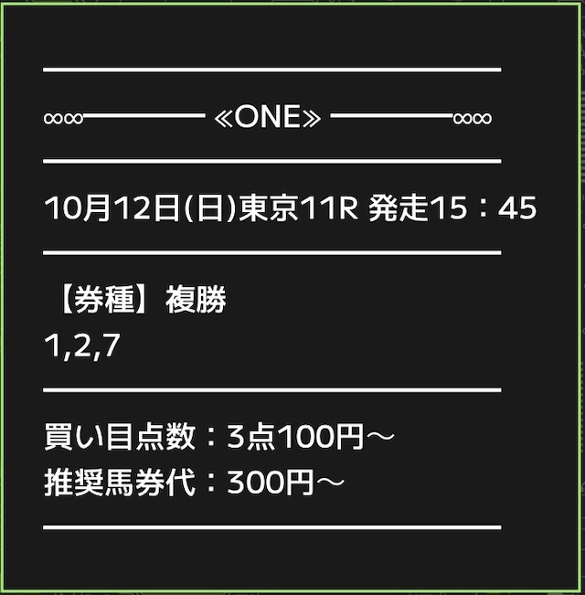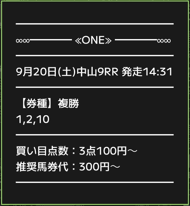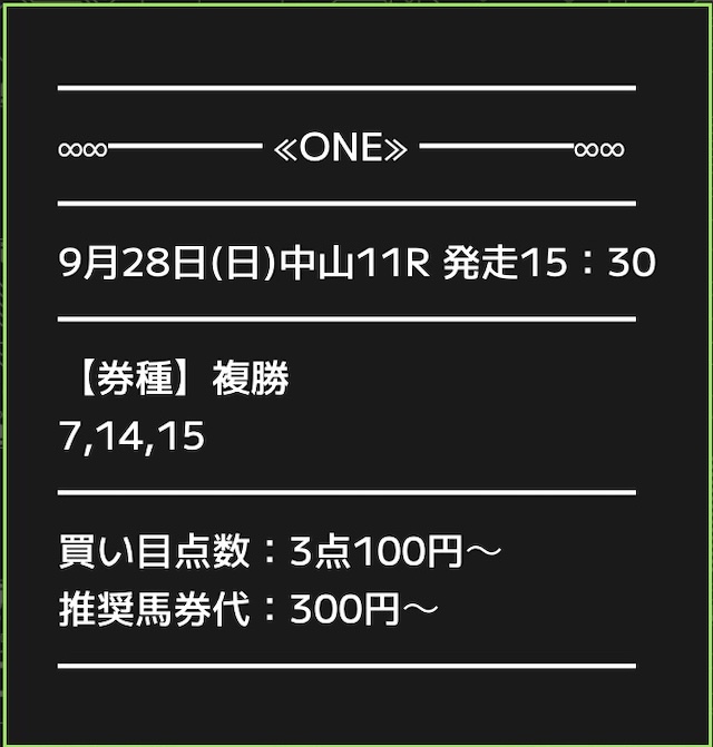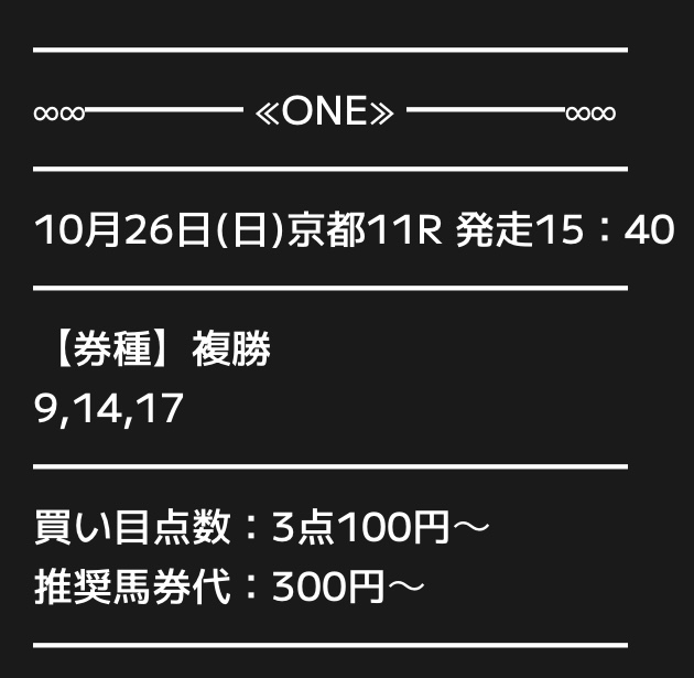 ONEは複勝3点予想を公開しており、馬券に絡む3頭全ての的中を狙っている可能性があるので穴馬メインの予想なら高配当的中になるかもしれません。