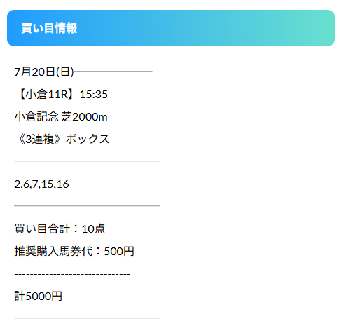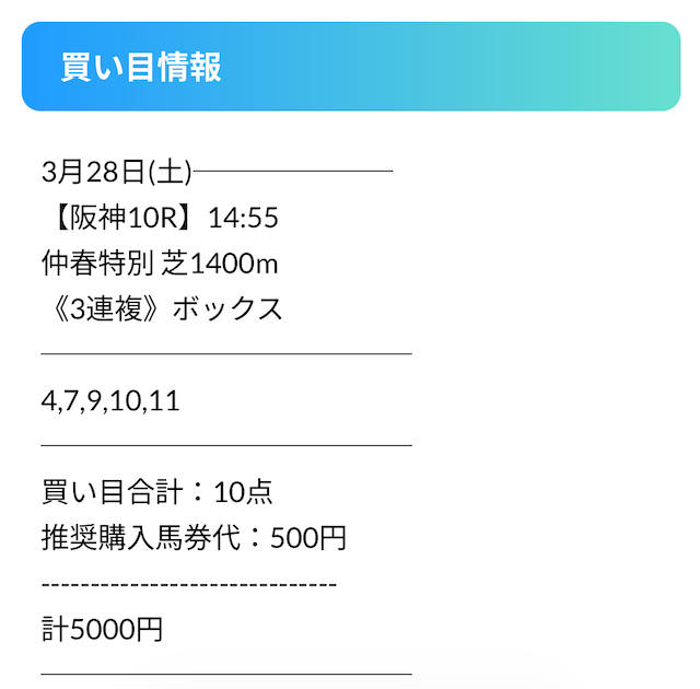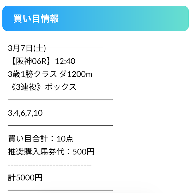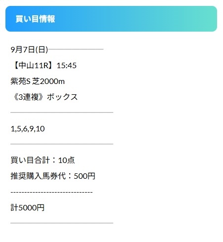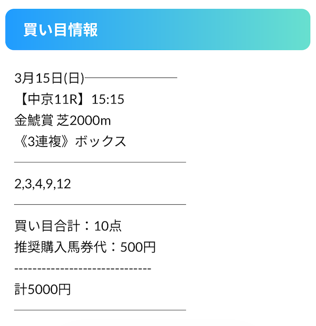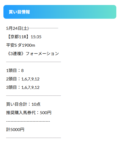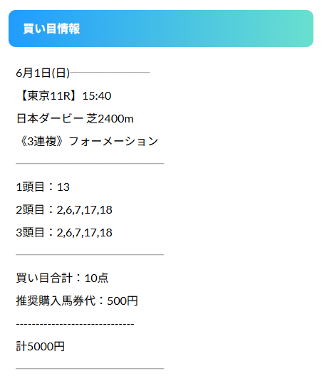 ガチ競馬は推奨通り、1点500円の計5,000円で勝負します。