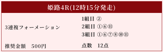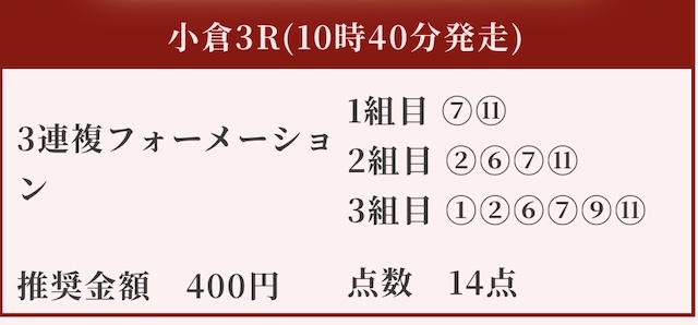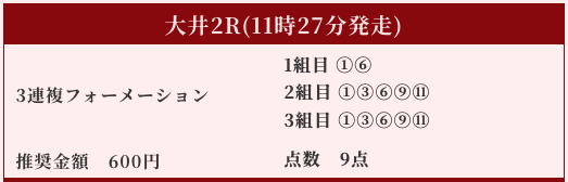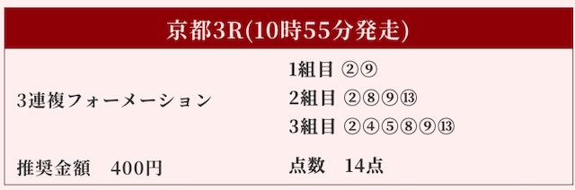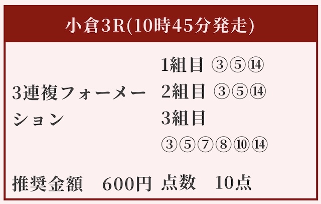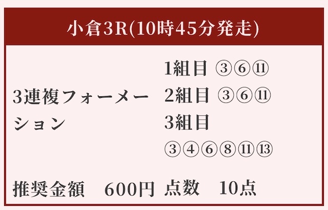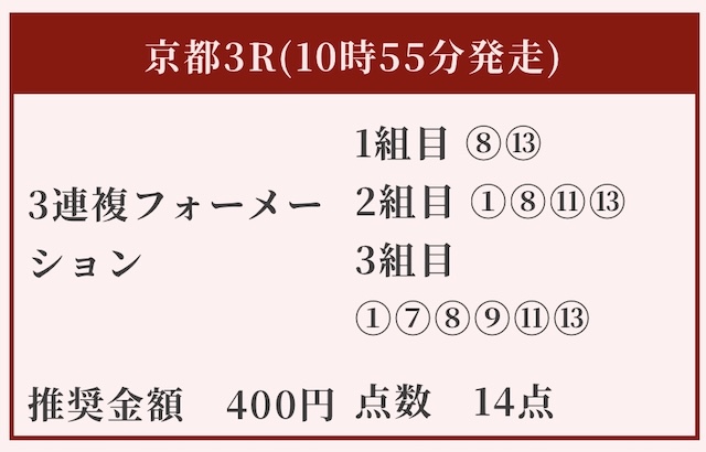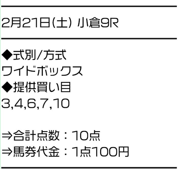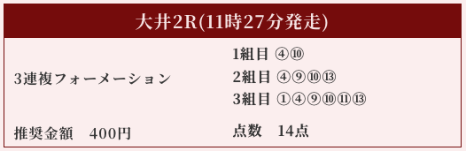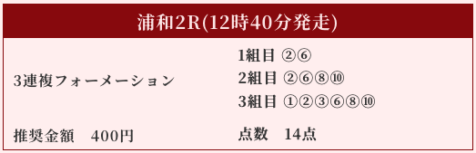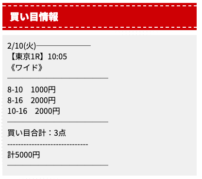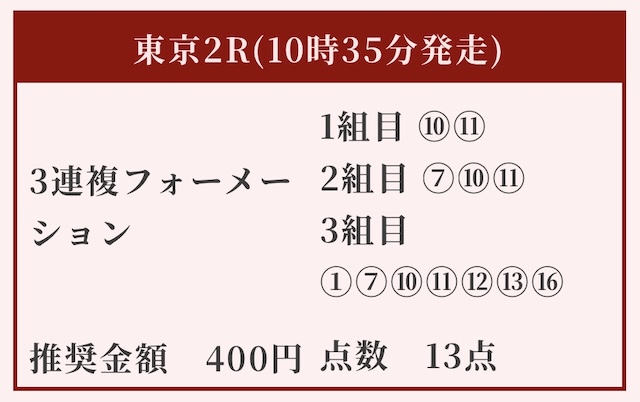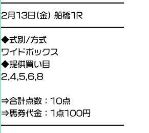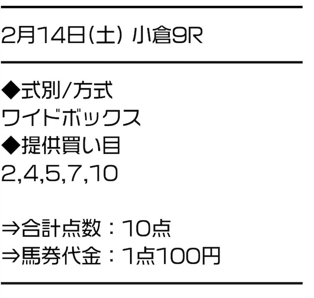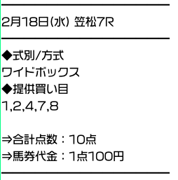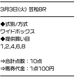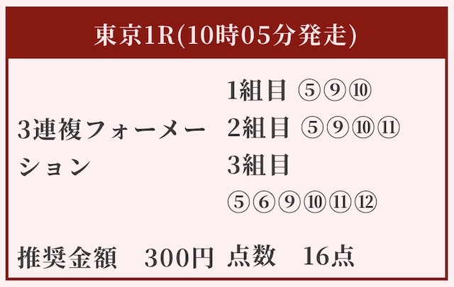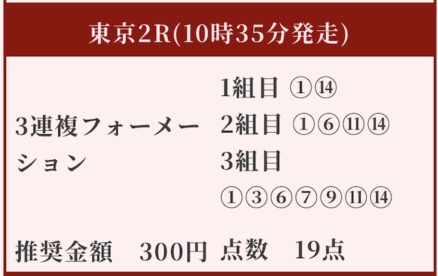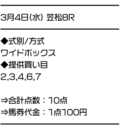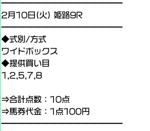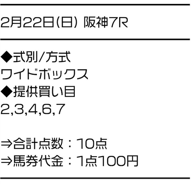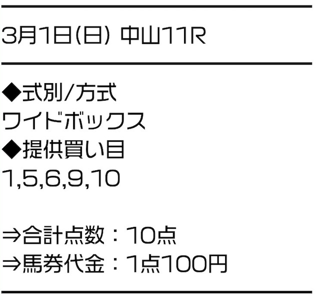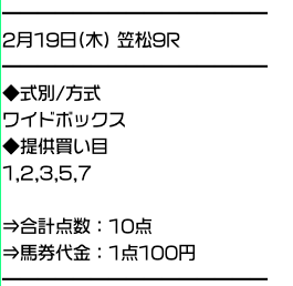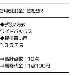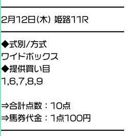 | 推奨馬券代 | 1レース10点/1点100円 |