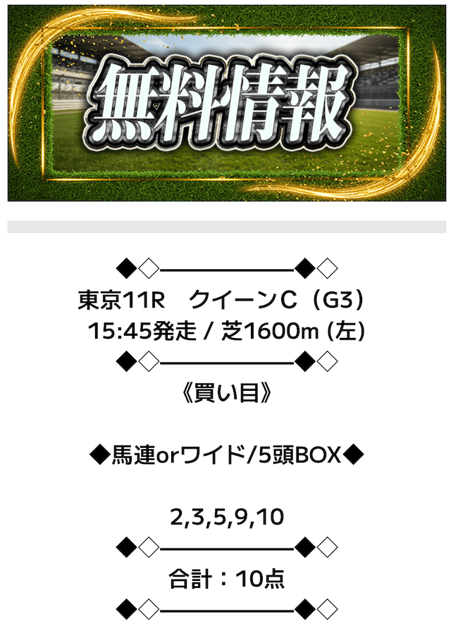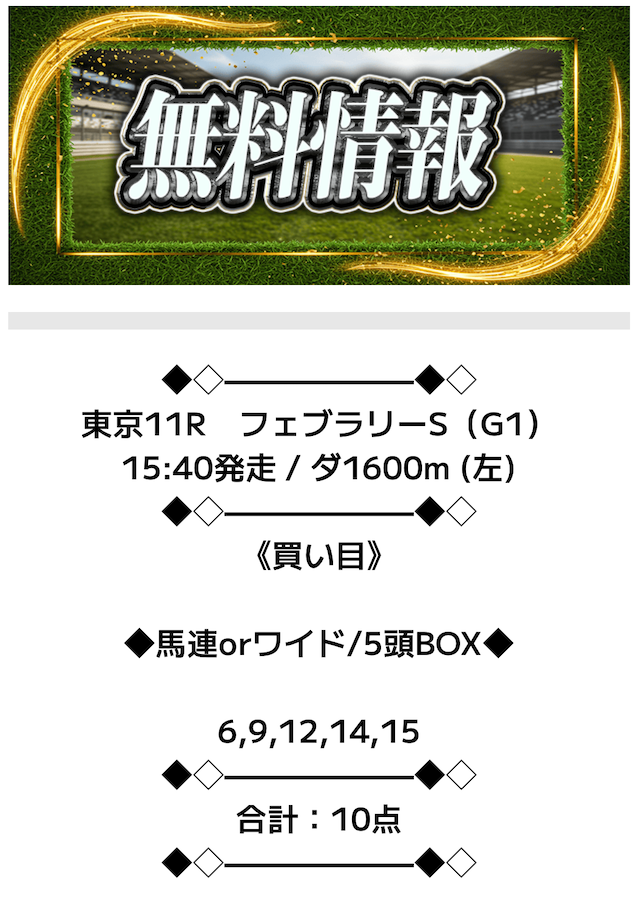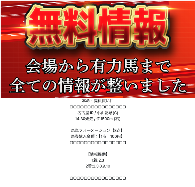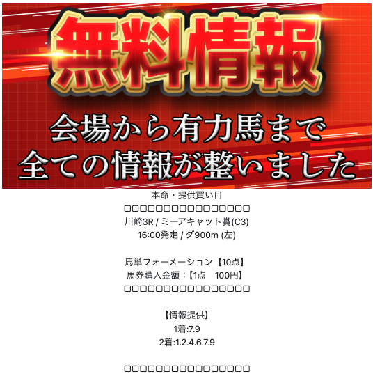 無料情報でも思った以上に当たります。中央より地方の方が調子良い時もありますね。予想の質が安定していると感じます。