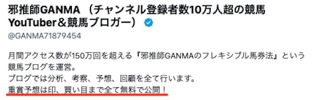 また、ブログにて買い目を無料公開と言っていますが、実際は競馬予想サイトを紹介しているだけで本人の予想(買い目)を見れるわけではないです。
