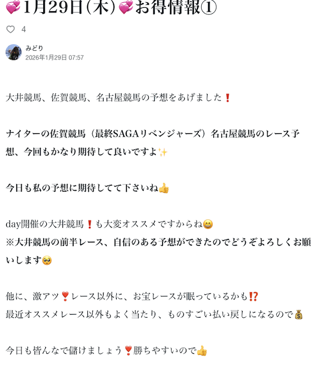 みどりのnoteには、毎日予想と一緒に「お得情報」が公開されます。
