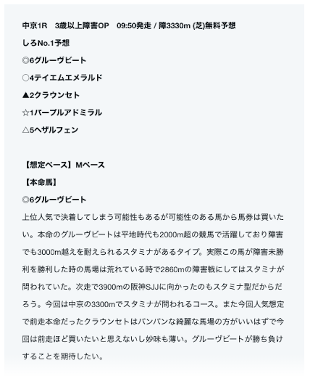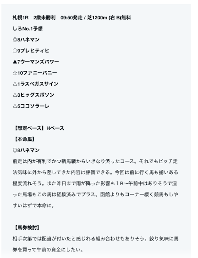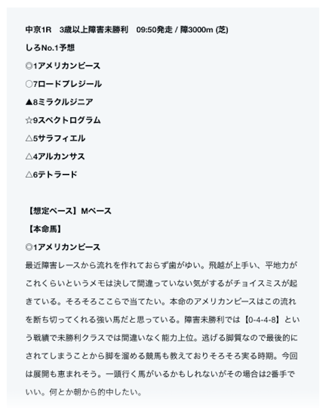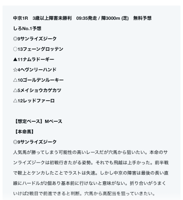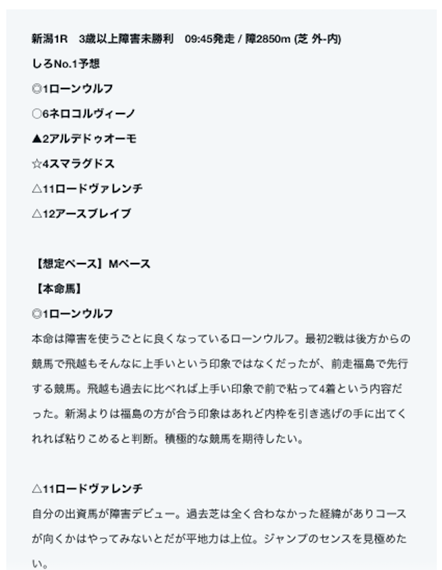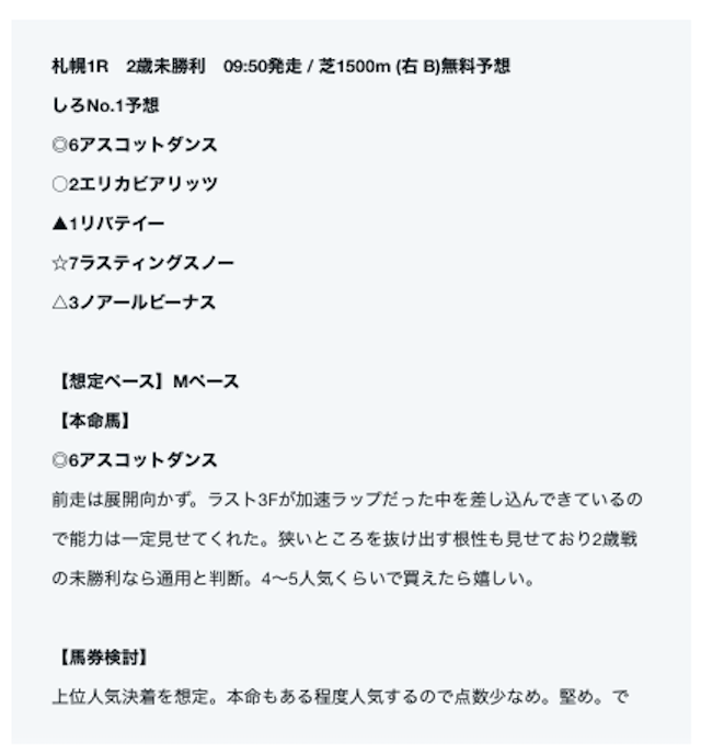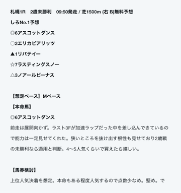 一方で、買い目が明記されていないため、競馬初心者や丸ノリ前提で予想を購入する人にとってはやや不親切に感じるかもしれません。