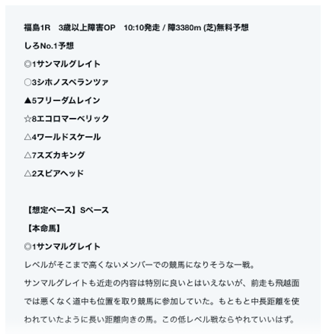 情報の内容としては本命馬の根拠がしっかりと語られており、人気薄に印が打たれることも多いため、予想の幅を広げたい人には参考になる内容です。