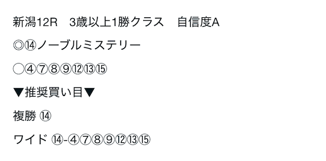 08/24 | 新潟12R | ⑭ | ④⑦⑧⑨⑫⑬⑮ | 不的中 | 不的中 | ||