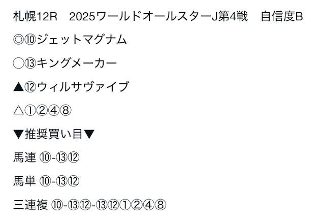 08/24 | 札幌12R | ⑩ | ⑬ | ⑫ | ①②④⑧ | 不的中 | ¥1,650 |