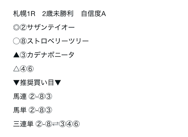 08/23 | 札幌1R | ② | ⑧ | ③ | ④⑥ | 不的中 | ¥2,570 |