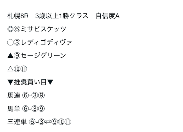 08/24 | 札幌8R | ⑥ | ③ | ⑨ | ⑩⑪ | 不的中 | ¥350 |