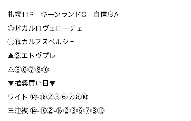08/24 | 札幌11R | ⑧ | ⑤ | ⑨ | ③④⑦⑩ | 不的中 | 不的中 |