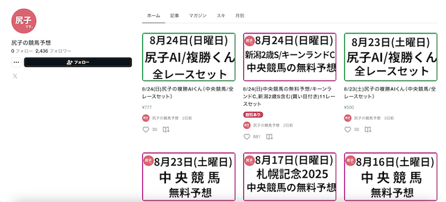 一方で、有料予想はAIに切り替わっており、尻子本人の予想かどうかの見分けがつきにくい点は少し気になるところ。