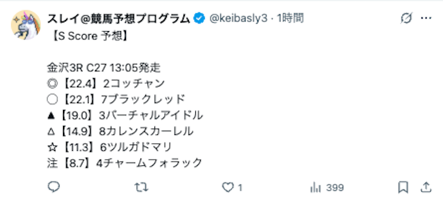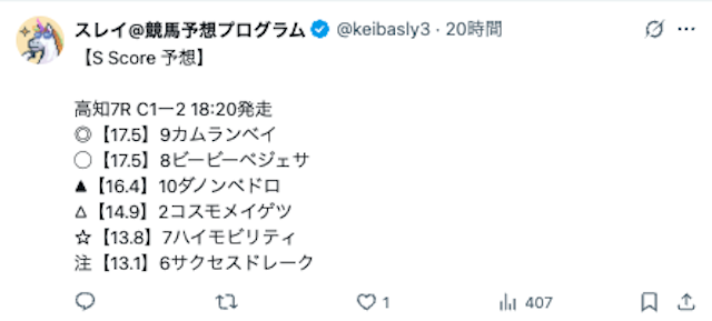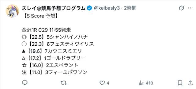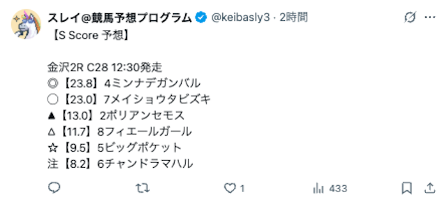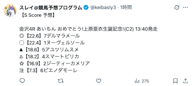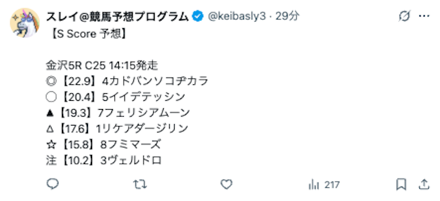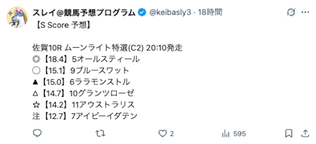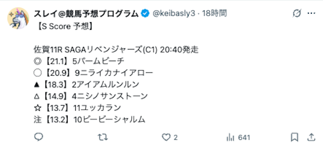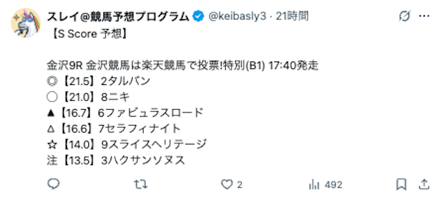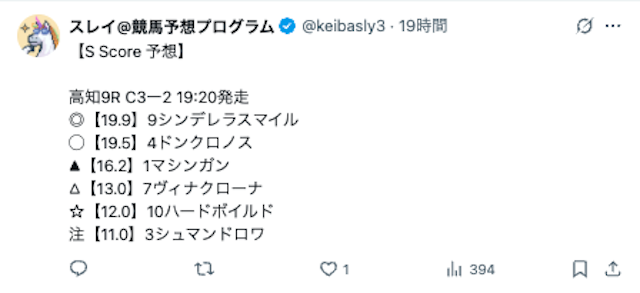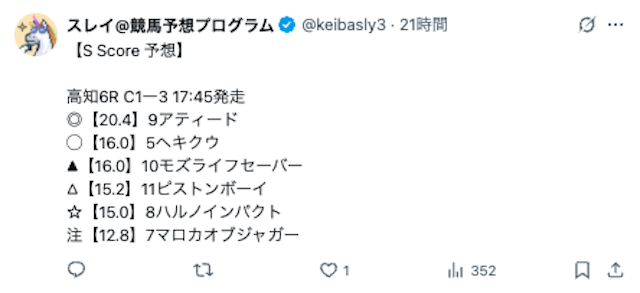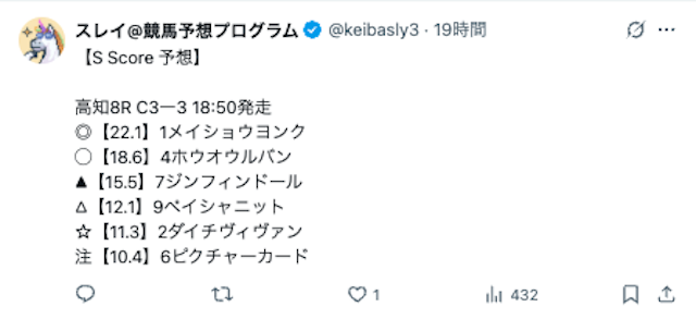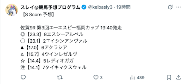 | @keibasly3 | SNS | Sスコアの無料自動投稿(中央・地方・20〜30R/日) |