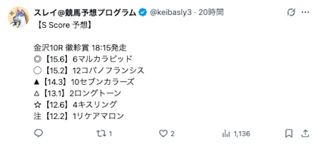 スレイ@さんの最大の特徴は、独自指数「Sスコア」によって全馬の期待値を自動で可視化している点にあります。